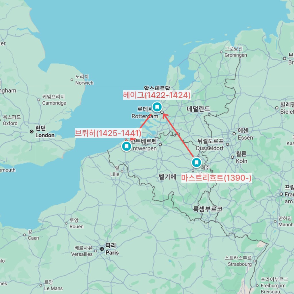 1422년 : 헤이그(Hague)에서 작센-바이에른 공작 요한 3세(John III of Bavaria)의 궁정화가로 활동한 기록이 최초로 등장합니다. 이 시기 그는 필사본 장식과 세밀화, 성화 제작에 참여했을 것으로 보이며, 초기 유화 기법 실험도 이때 시작했을 가능성이 있습니다.