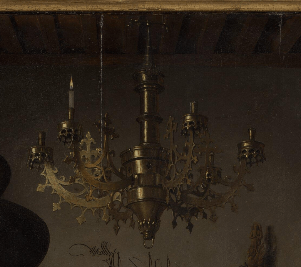 이처럼 얀 반 에이크는 이 작품에서 당시 생활용품을 그대로 그려넣었기 때문에, 실제 방을 있는 그대로 그린 것처럼 보입니다. 하지만 방안의 모든 사물들이 부부의 부와 지위를 과시하되, 귀족을 흉내낸다는 비판을 피할 수 있도록 신중하게 선택된 것 같다는 의견이 더욱 우세하지요.