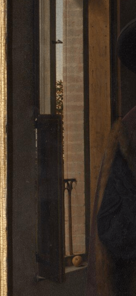 그다지 크지 않은 작품이기 때문에 이 세밀한 묘사는 가까이서 눈을 크게 뜨고 봐야 알아보실 수 있습니다. 얀 반 에이크의 세밀하고 현실적인 묘사가 놀랍기만 합니다.