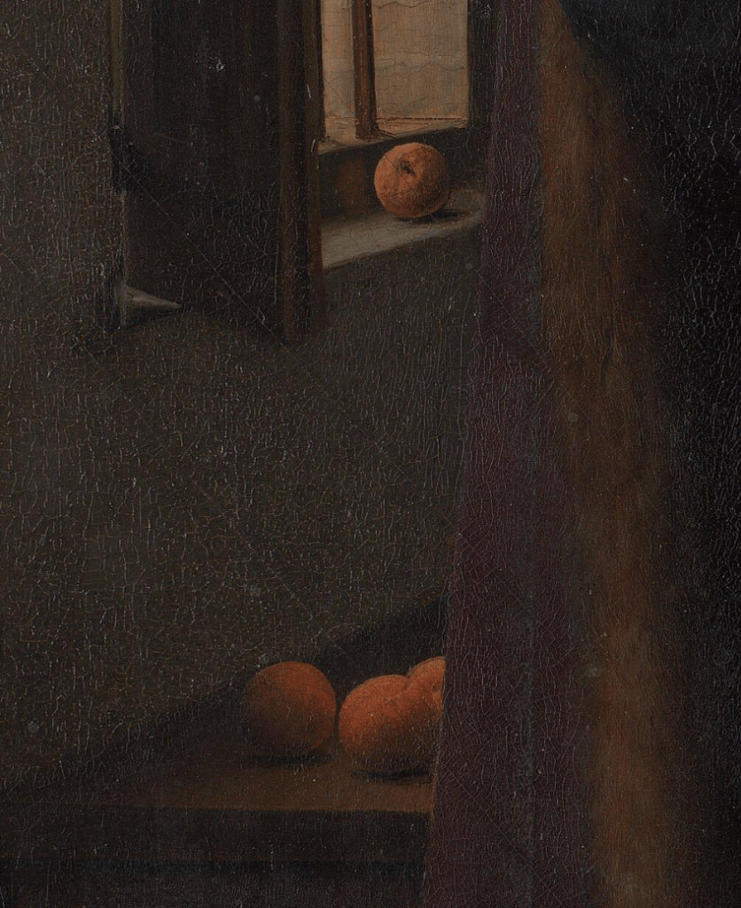 무심하게 놓여진 오렌지는 사실 이 부부의 부를 상징하는 것일 수 있습니다. 당시에 오렌지는 무척 비싼 과일이었거든요. 수입 과일이라는 점도 상인 계급으로서 국제 무역 자부심을 표현하는 상징일 수도 있지요.