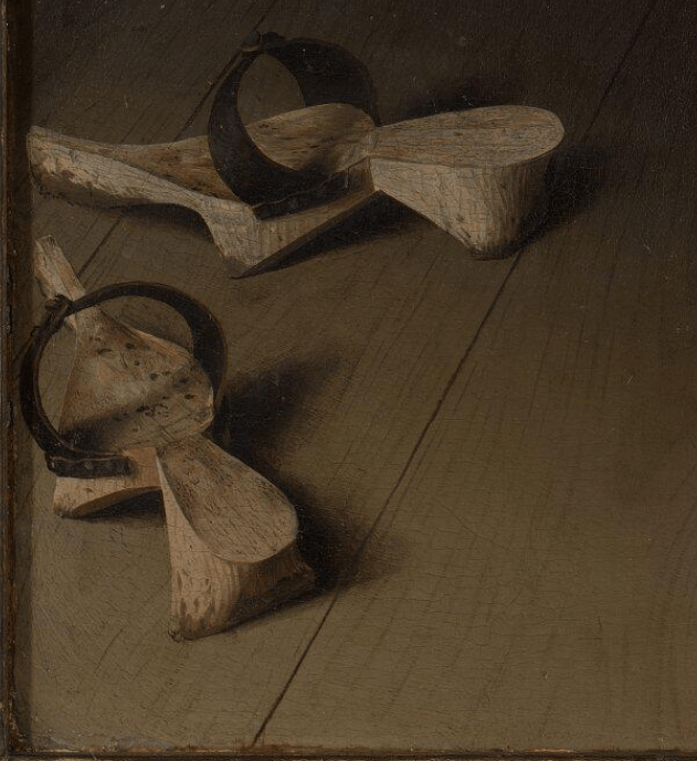 이것은 패튼(Patten)이에요. 패튼은 14-19세기 유럽에서 신었던 덧신입니다. 신발을 신은 채로 덧신는, 바닥이 두껍고 딱딱한 덧신이죠. 나무, 가죽, 금속 등으로 발 모양의 평평한 판을 만들고, 끈이나 가죽 스트랩을 달아 만들었습니다. 당시에 도시 거리는 배수 시설이 나빠서 흙탕물, 오물, 쓰레기가 아주 많았어요. 그림에 보이는 패턴 바닥에도 진흙이 묻어있는 것으로 보여요. 패튼을 신고 외부활동을 하다가 실내에 들어오면 벗어서 실내 바닥을 깨끗하게 유지하고자 한거죠. 또한 당시 신발은 부드러운 재질의 가죽 신발이 많았기 때문에, 신발을 보호하는 역할도 했다고 합니다.